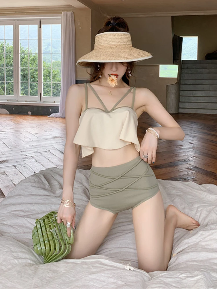 2019 New Korean Women Two Pieces Swimwear Sexy High-waist Cross Strap Neckline Halter Strapless Fal